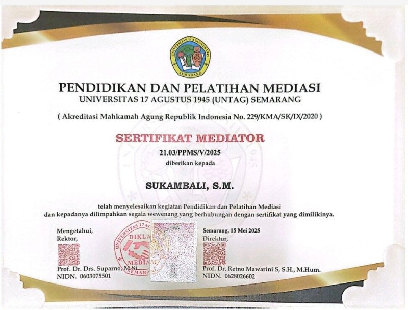 Diketahui, selain menjabat sebagai Petinggi Desa Kecapi, Sukambali saat ini tengah menempuh pendidikan S2 Magister Manajemen (MM) dan Magister Hukum (MH). Ia juga memiliki sertifikat mediator Nomor 21.03/PPMS/V/2025 yang diterbitkan oleh Lembaga Diklat Pendidikan dan Pelatihan Universitas 17 Agustus 1945 (UNTAG) Semarang pada 15 Mei 2025.