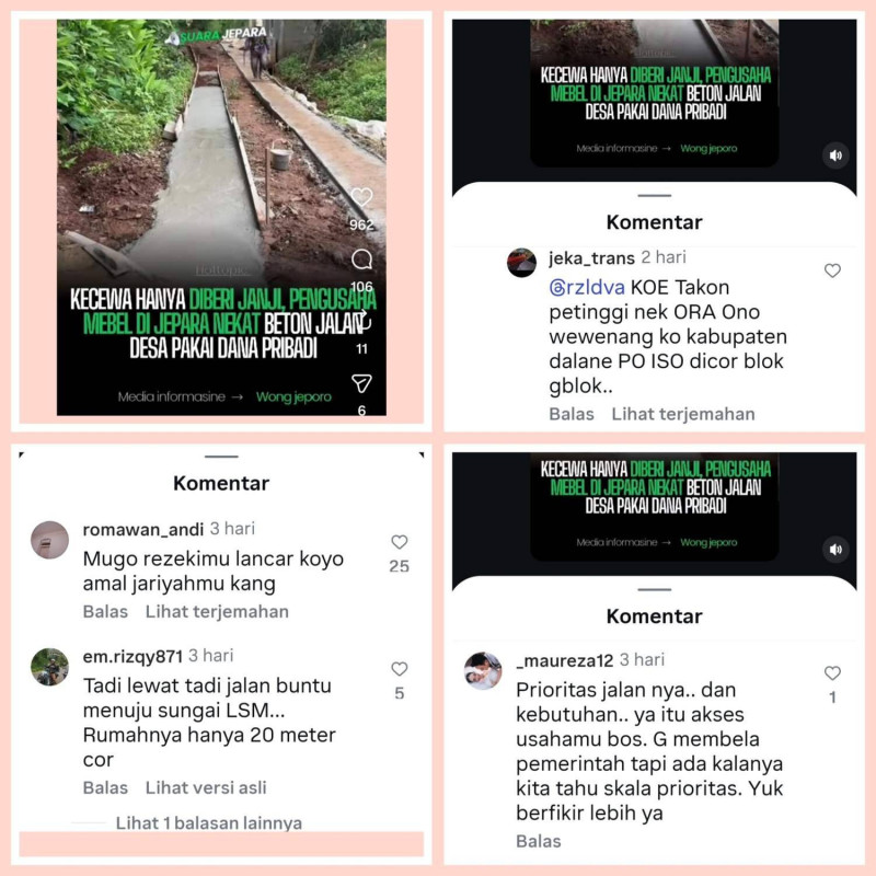 Sebelumnya, pembangunan jalan tersebut sempat viral di media sosial Instagram melalui akun @suara.jepara pada Jumat (06/02/2026). Dalam unggahan tersebut, beberapa warganet memberikan komentar, di antaranya dari akun @_maureza12, @em.rizqy871, dan @jeka_trans, yang turut menyoroti inisiatif warga dalam pembangunan jalan desa.
